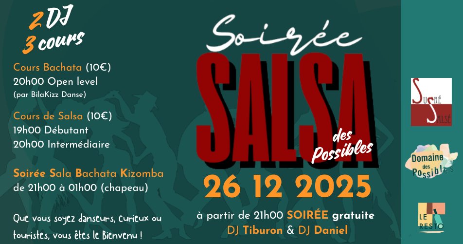 Soirée Salsa des Possibles 21h00 à 01h00 Soirée Salsa Bachata KizombaDj Tiburon & Dj Daniel Les Cours Dans la Salle de Bal: 19h00 à 20h00 Cours de salsa débutant par […]
