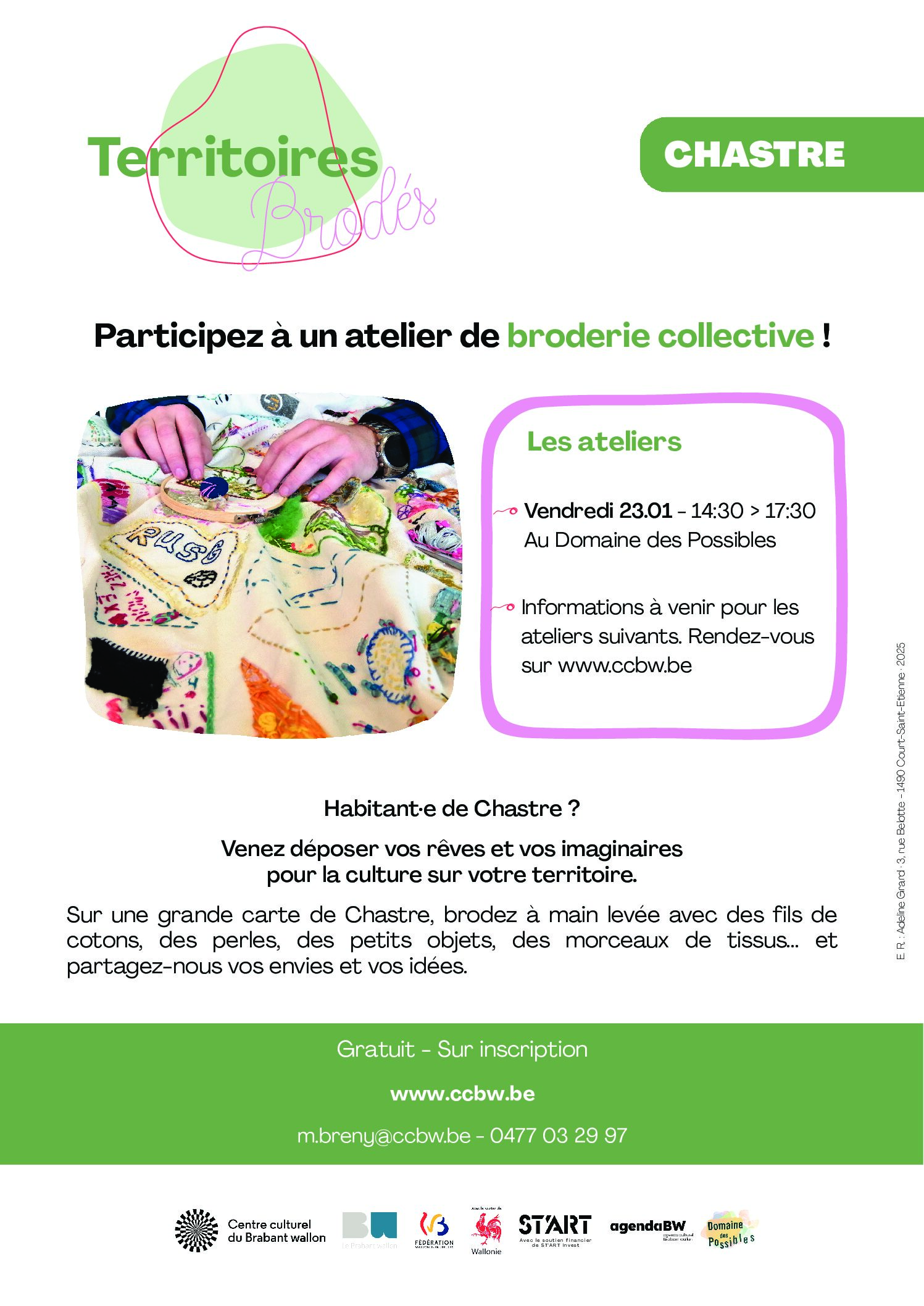 Les ateliers Vendredi 23.01 - 14:30 > 17:30 Au Domaine des Possibles Participez à un atelier de broderie collective ! Gratuit - Sur inscription www.ccbw.be m.breny@ccbw.be - 0477 03 29 […]