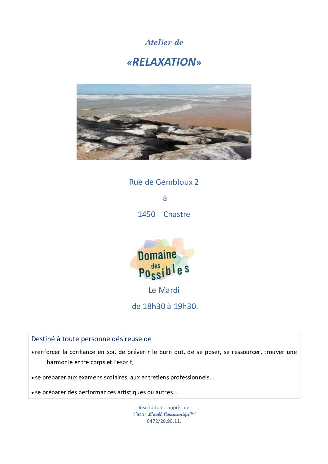 Inscription: par mail à corinne.courtois.psy@gmail.com par sms au 0478 48 27 95