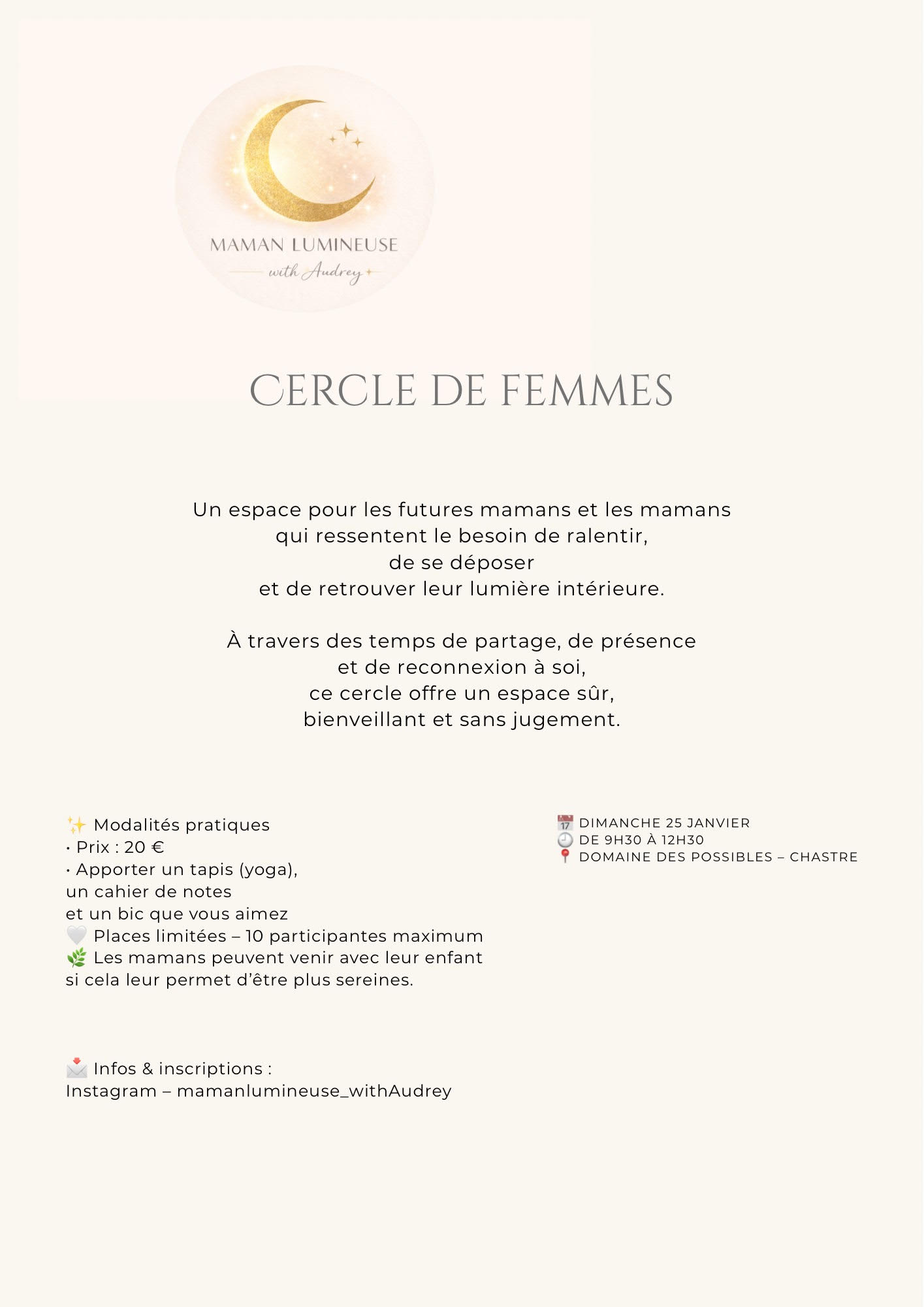Venez vivre un moment de relaxation sonore et vibratoire avec les bols chantants, les koshis, le bâton de pluie, la cloche de cristal,… Vous ressentirez une détente profonde, un calme intérieur, une reconnexion à votre corps, un lâcher-prise 𝐒𝐞́𝐚𝐧𝐜𝐞 𝐝𝐞́𝐜𝐨𝐮𝐯𝐞𝐫𝐭𝐞 𝐮𝐧𝐢𝐪𝐮𝐞𝐦𝐞𝐧𝐭 𝐩𝐨𝐮𝐫 𝐥𝐞 𝟐𝟔 𝐧𝐨𝐯𝐞𝐦𝐛𝐫𝐞 𝟐𝟎€/𝐩𝐞𝐫𝐬. 𝙇𝙄𝙀𝙐 : Domaine des Possibles, 2 Rue de Gembloux […] |