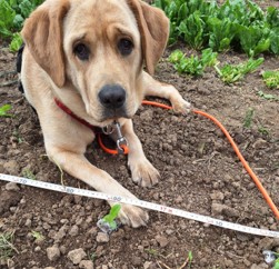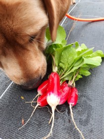 Petite chienne blonde, jeune, gourmande et espiègle. Très créative quand il s’agit de faire des bêtises, mais aussi curieuse et câline. Responsable officielle du contrôle qualité des légumes et des pauses tendresse.