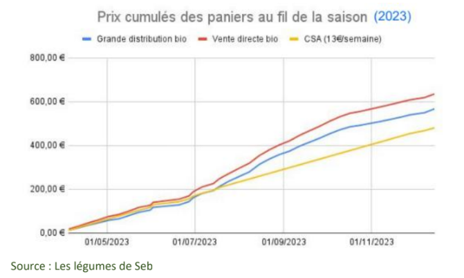 Pour cette étude, il a comparé le prix du panier de ses mangeur·ses — fixé à 13 € par semaine et par adulte pendant 38 semaines — avec ce que ces mangeur·ses auraient payé pour des légumes équivalents, en termes de variétés et de quantités, achetés soit en grande distribution bio, soit en direct chez un·e maraîcher·e bio, mais sans formule d’abonnement.